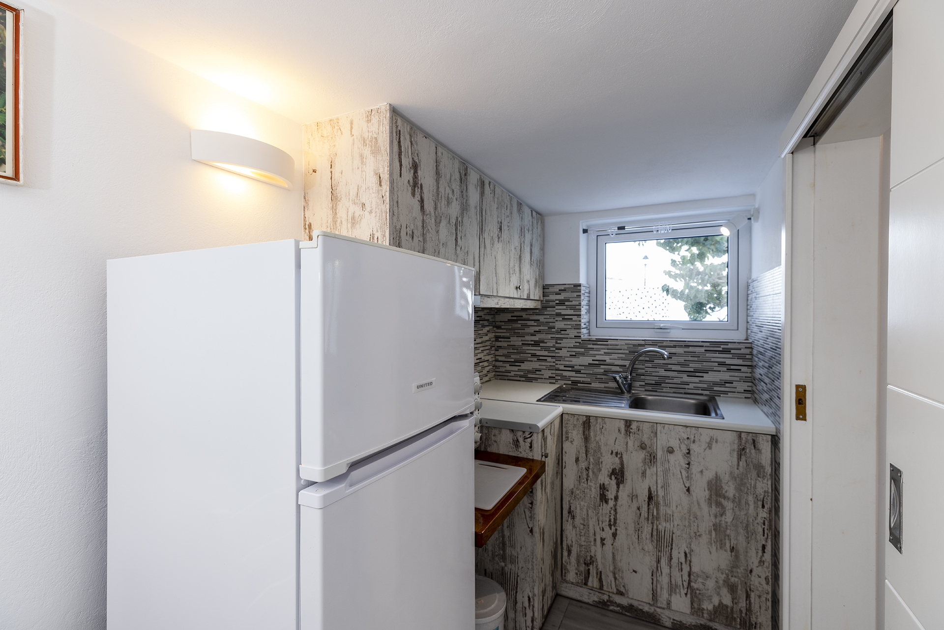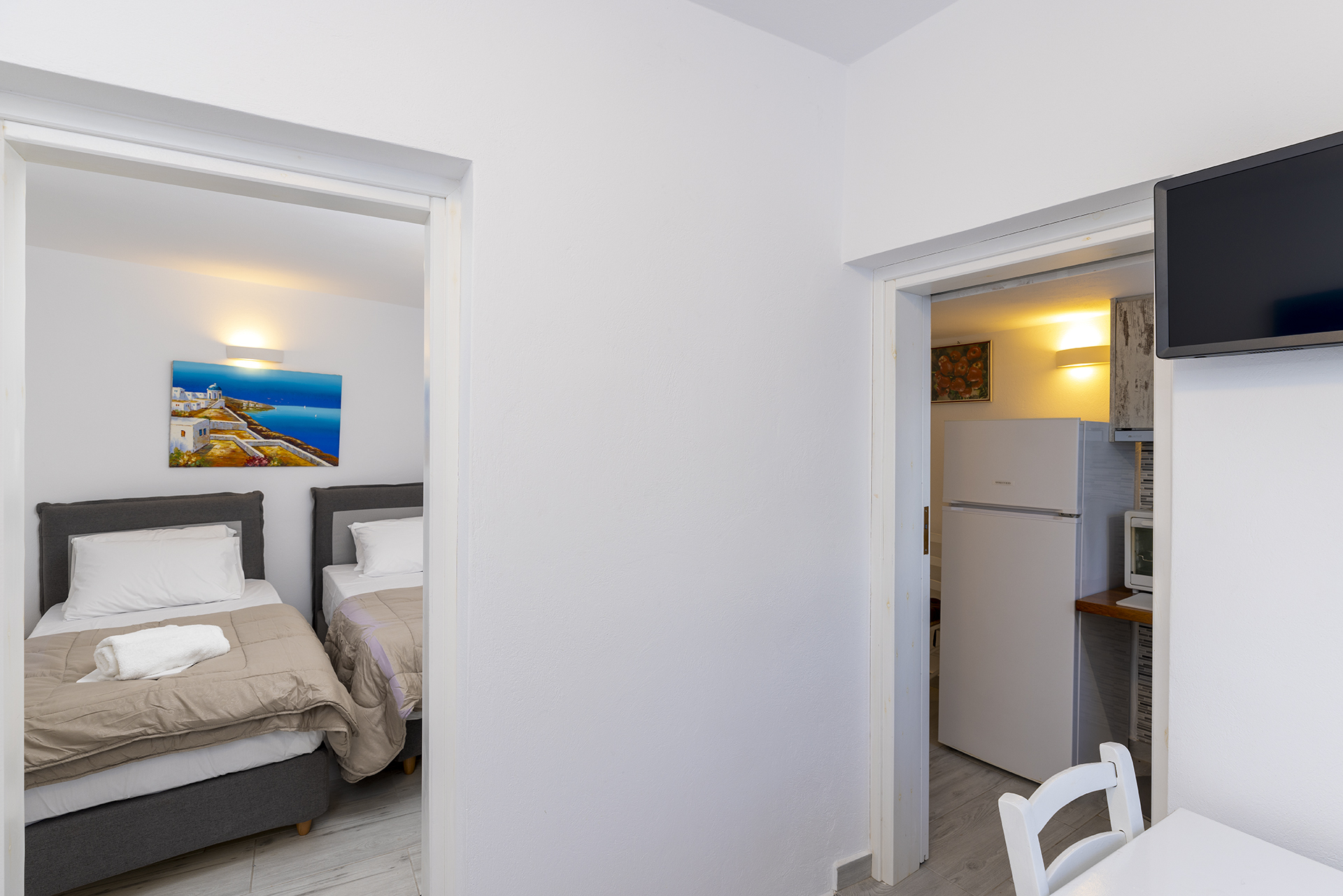 This room is suitable for a family or a group of friends. It consists of a bedroom with two single beds and a living room in which there is still a single bed and a dining room. It has a fully equipped kitchen and a bathroom with shower. The courtyard overlooks the sea.