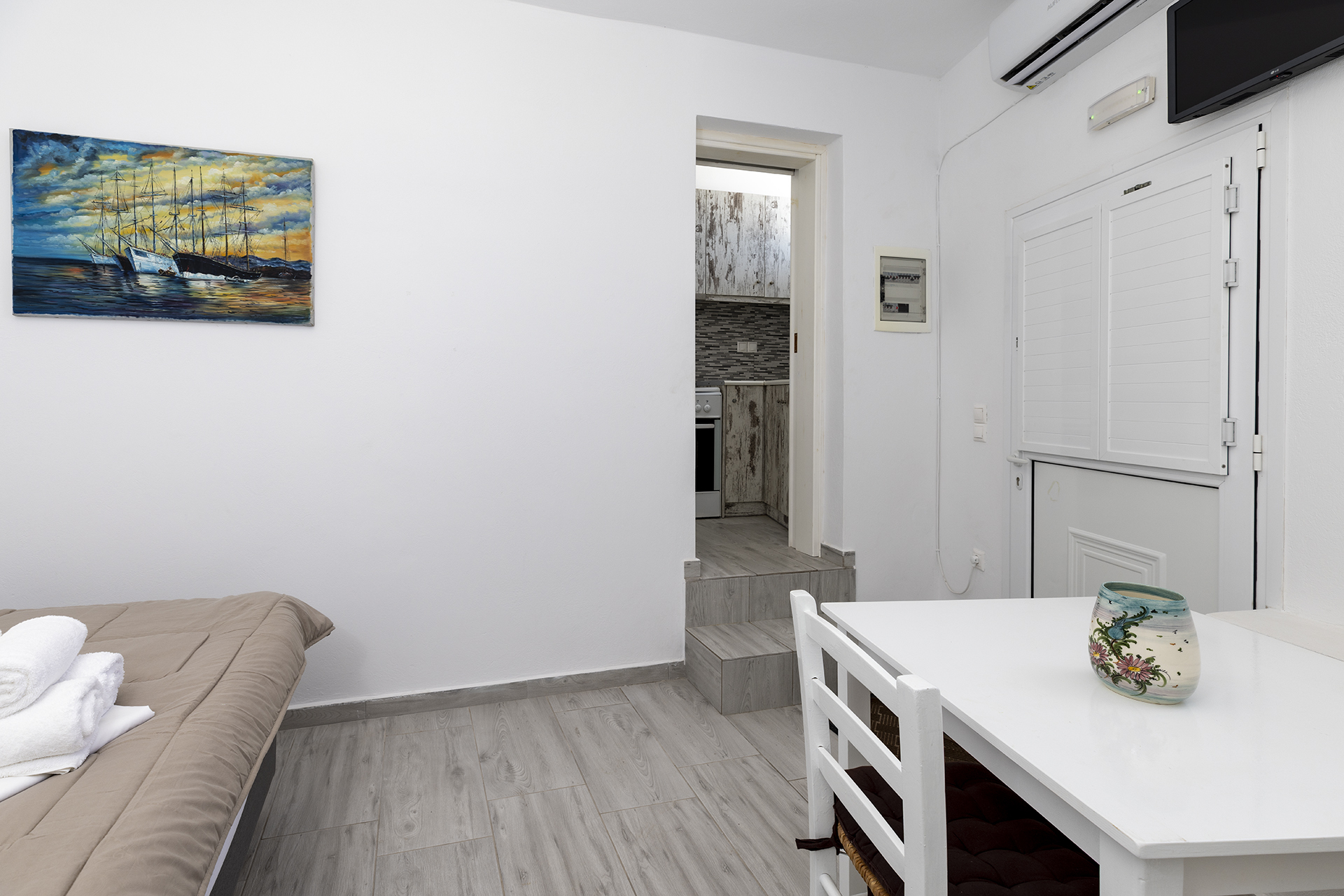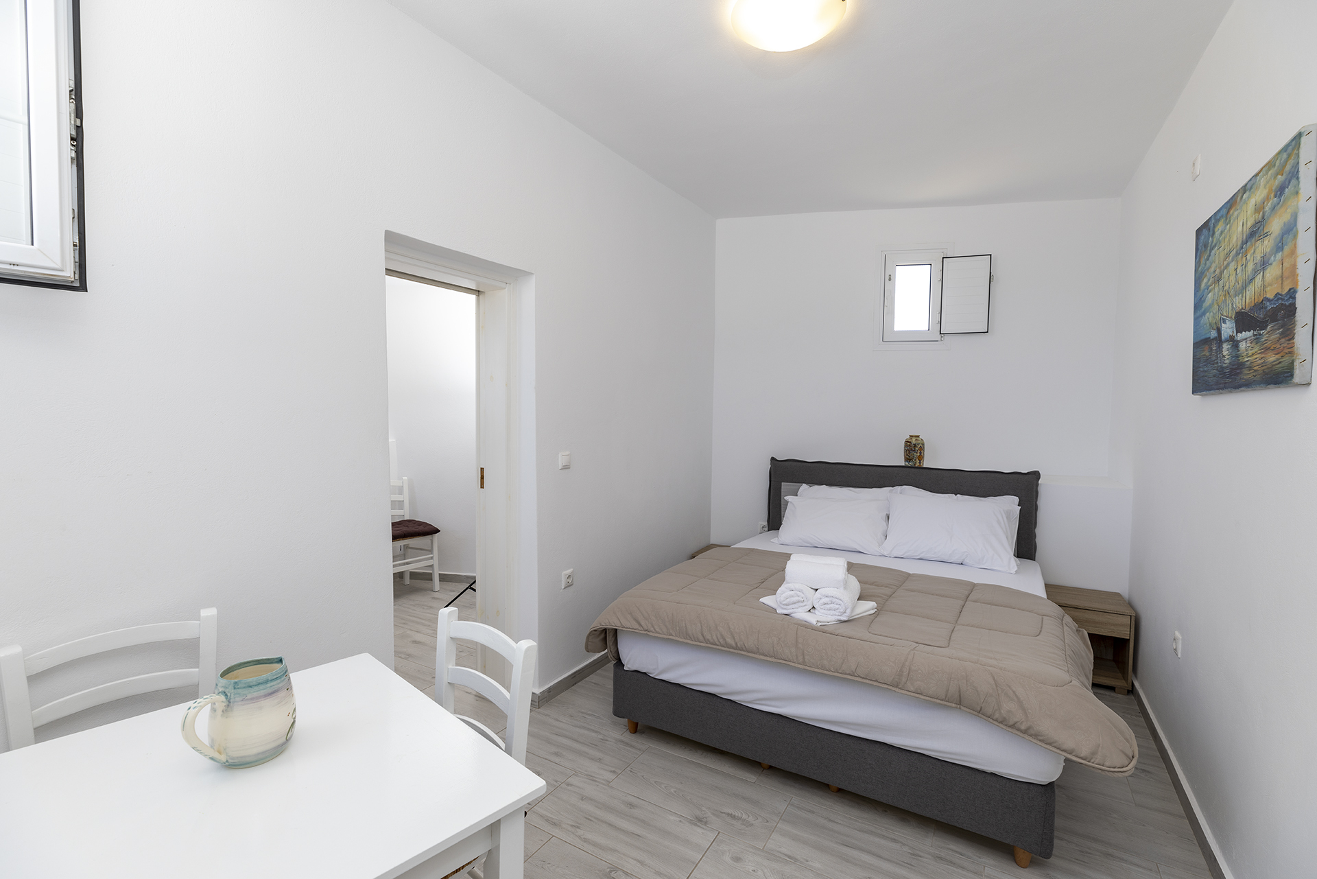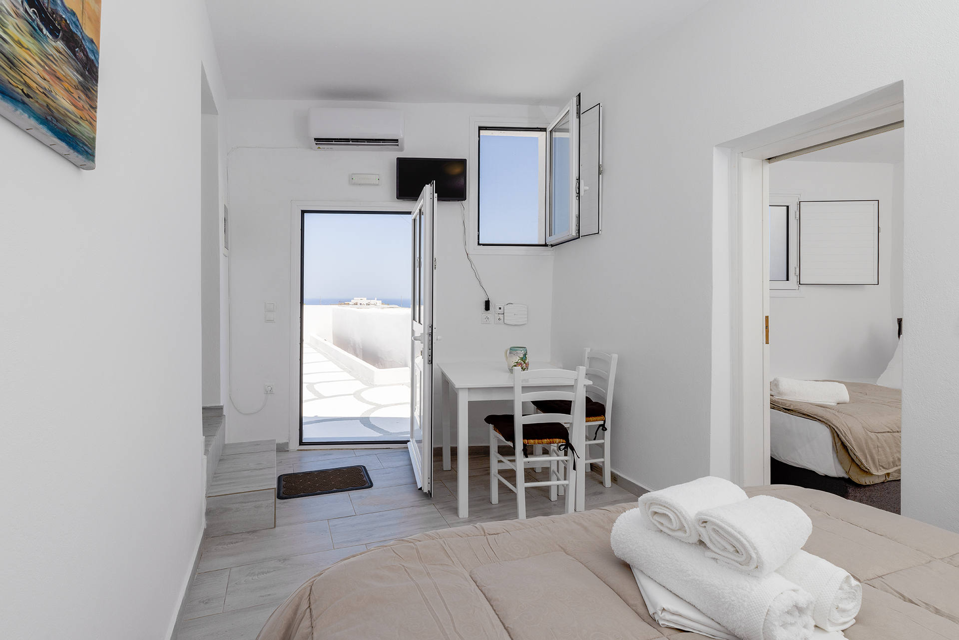 This comfortable room is ideal for a family or a group of friends. It consists of a spacious living room in which there is a double bed and dining room. It has a bedroom with a single bed in which there is the possibility upon request for an extra bed. It has a fully equipped kitchen and a bathroom with shower. The courtyard overlooks the sea.