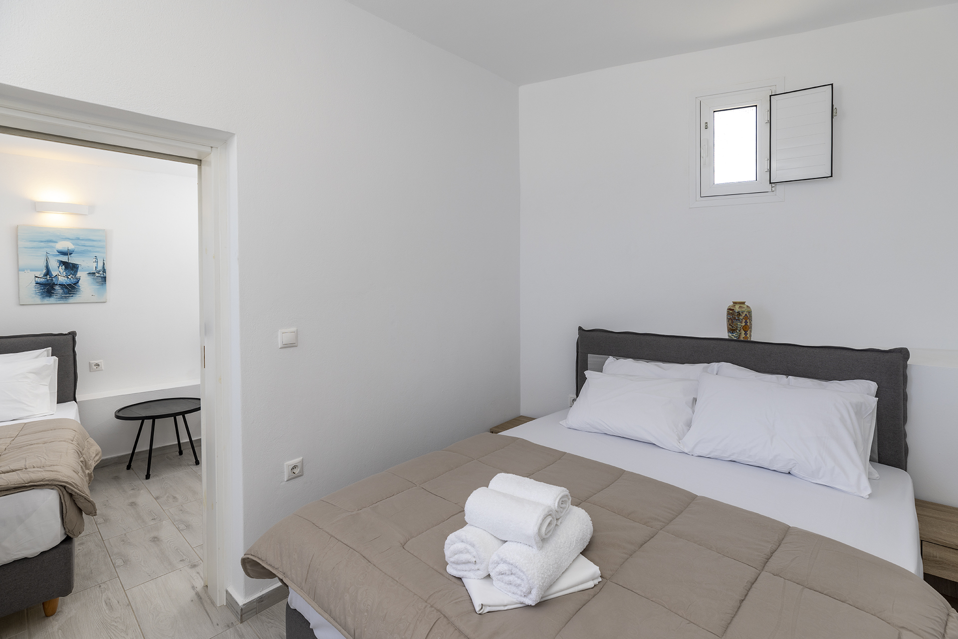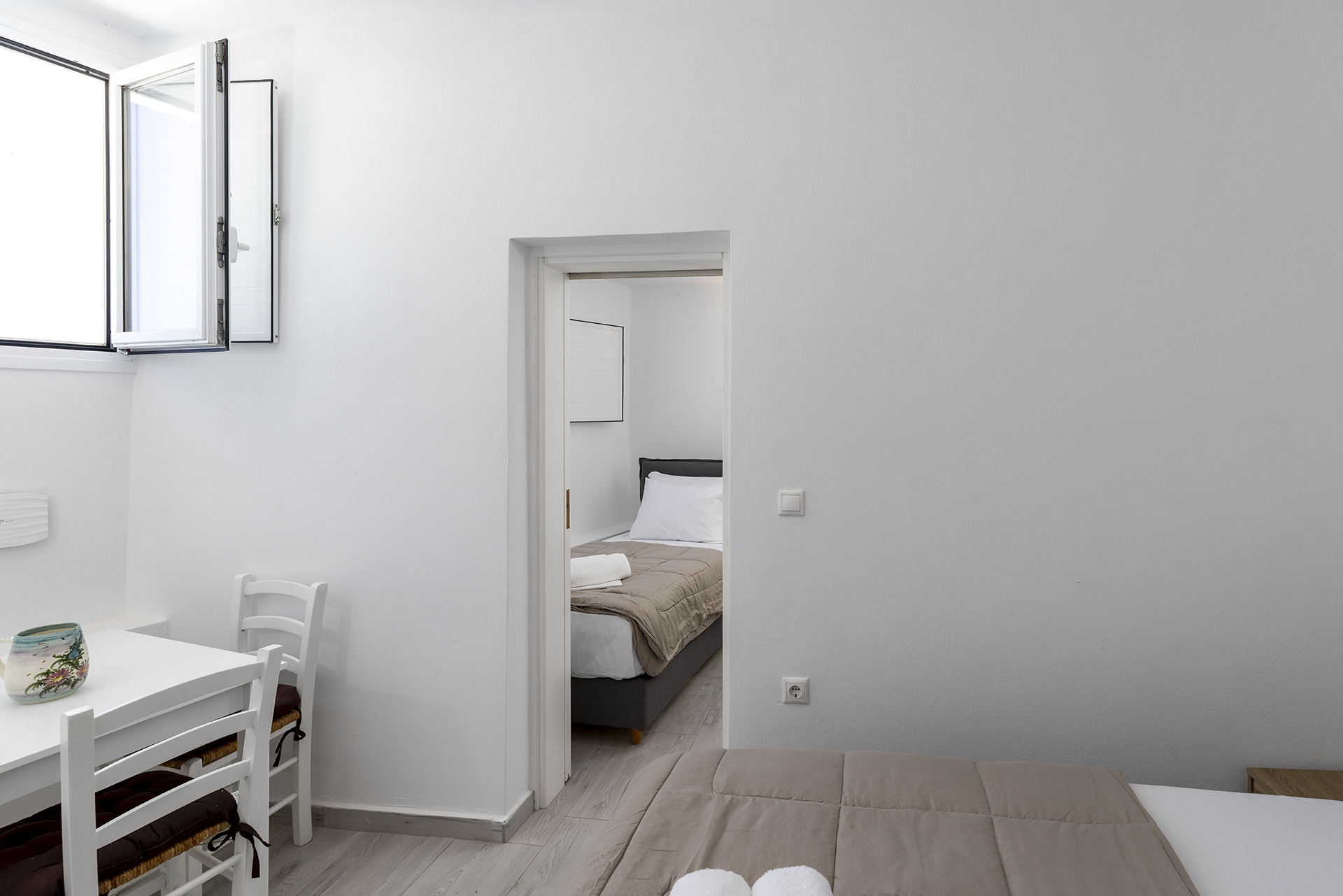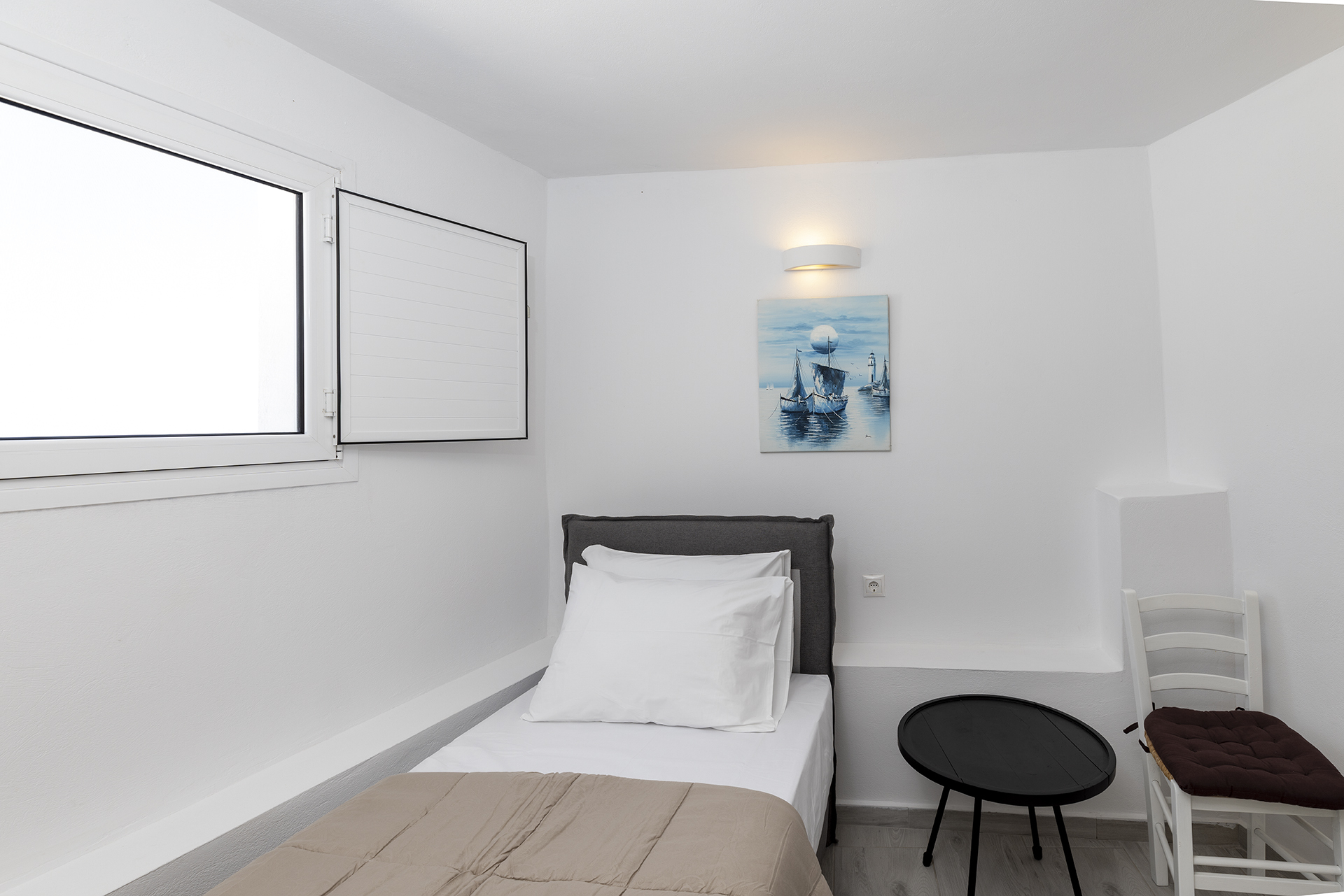 This comfortable room is ideal for a family or a group of friends. It consists of a spacious living room in which there is a double bed and dining room. It has a bedroom with a single bed in which there is the possibility upon request for an extra bed. It has a fully equipped kitchen and a bathroom with shower. The courtyard overlooks the sea.